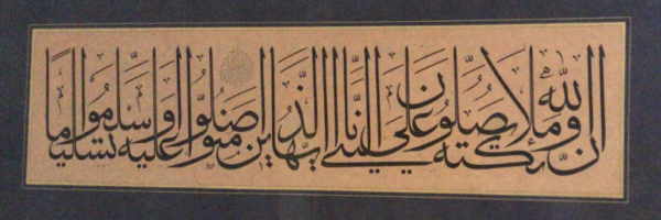 Translation: "Indeed, Allah and His angels send blessings upon the Prophet. O you who have believed, ask [ Allah to confer] blessing upon him and ask [ Allah to grant him] peace."